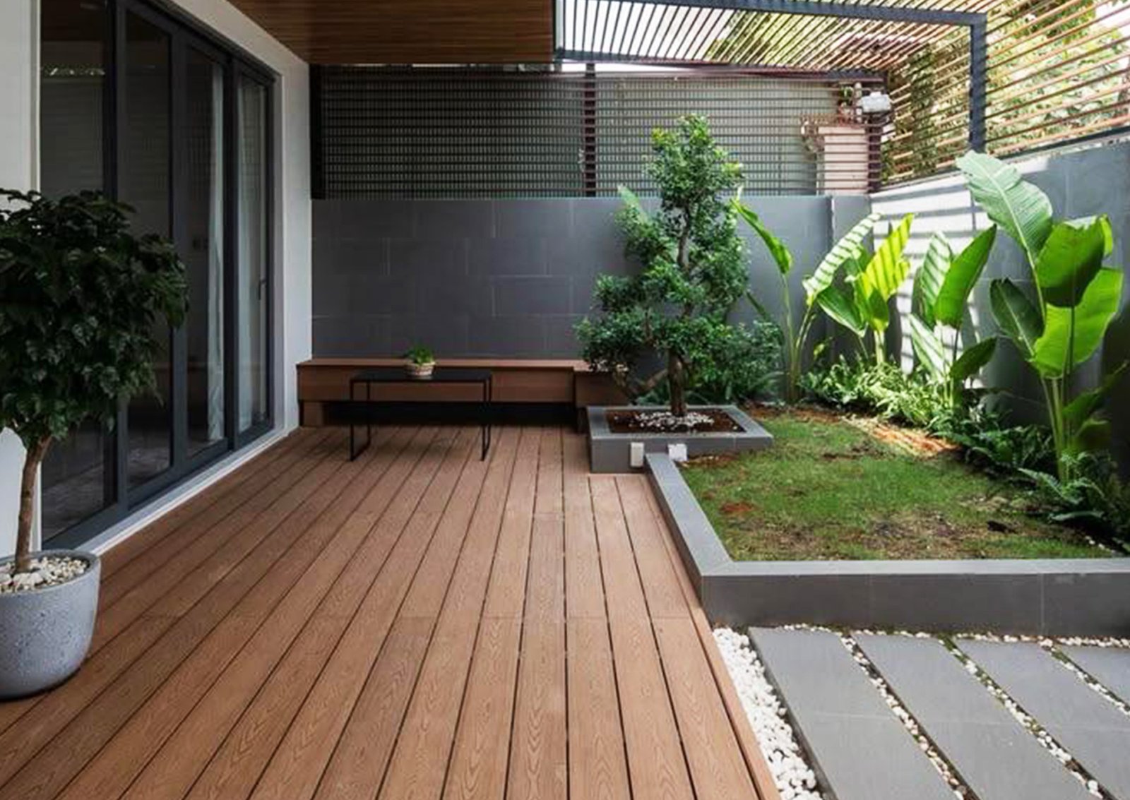 Deck para exteriores en material compuesto (WPC) de alta durabilidad. Ideal para tu terraza, jardín o área de piscina: resiste sol, lluvia y humedad sin pudrirse ni astillarse, brindando la estética de la madera con mínimo mantenimiento.